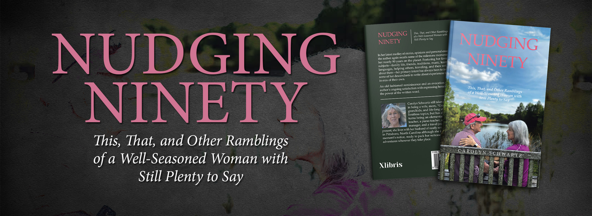 Carolyn Schwartz still takes great joy in being a wife, mom, “Gran” to 12 grandkids, and life-long student of limitless topics, but has also taken turns being an elementary school teacher, a piano teacher, a property manager, and a travel journalist.